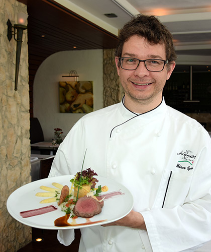 Und dann kommt ein Essen, das zum großartigen Panorama passt – auf dem Teller kunstvoll drapiert, mit frischen regionalen Zutaten versehen, aromatisch, voller Geschmack, zubereitet auf ganz hohem Niveau. Verantwortlich dafür zeichnet Heiner Eyers, ein Küchenchef mit Leidenschaft für frische Produkte und für echten Genuss auf dem Teller. Der 43-Jährige führt seit 2001 die Geschicke „Am Rosenberg“ und lockt seither begeisterte Feinschmecker und alle, die es werden wollen, in sein behagliches Restaurant.