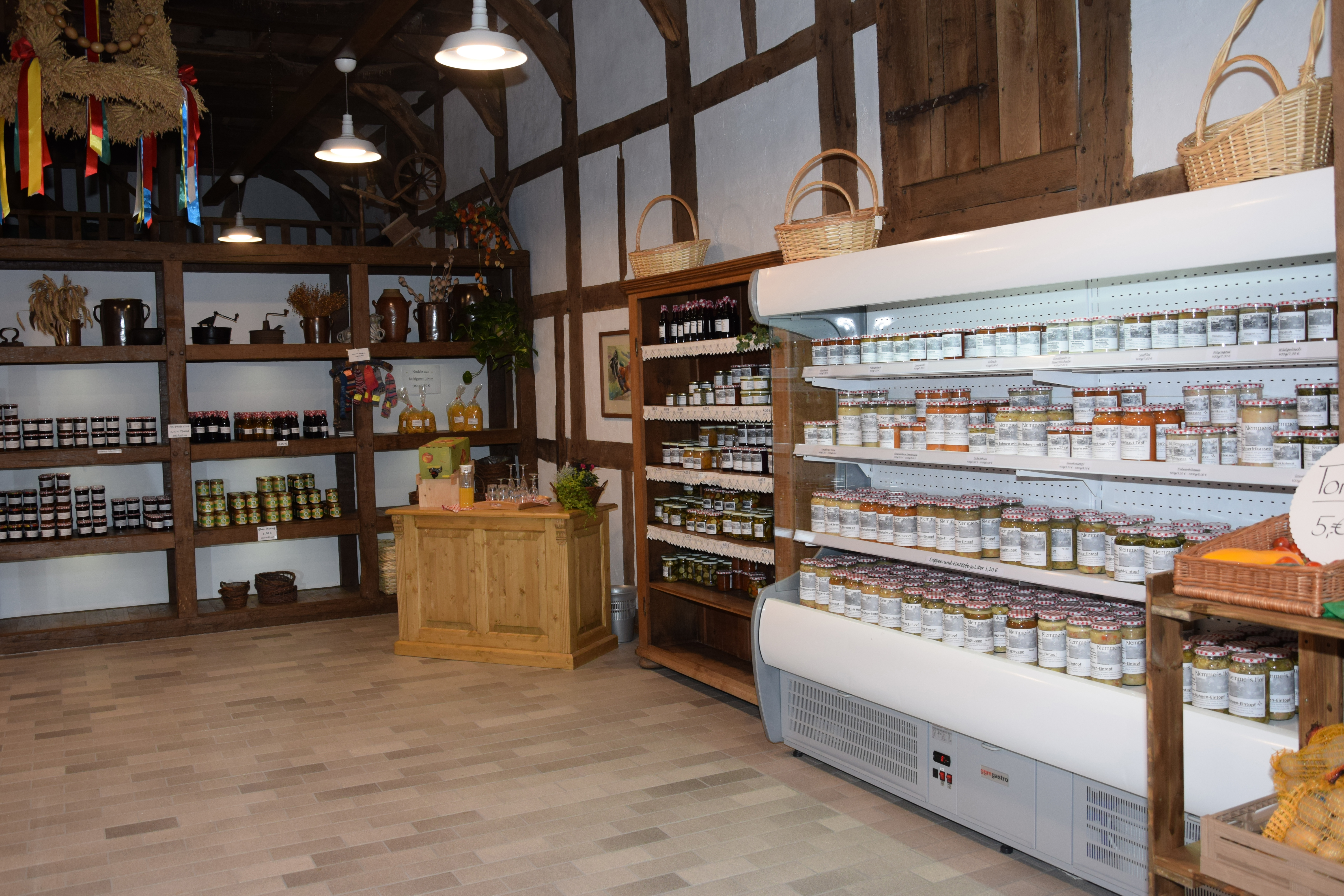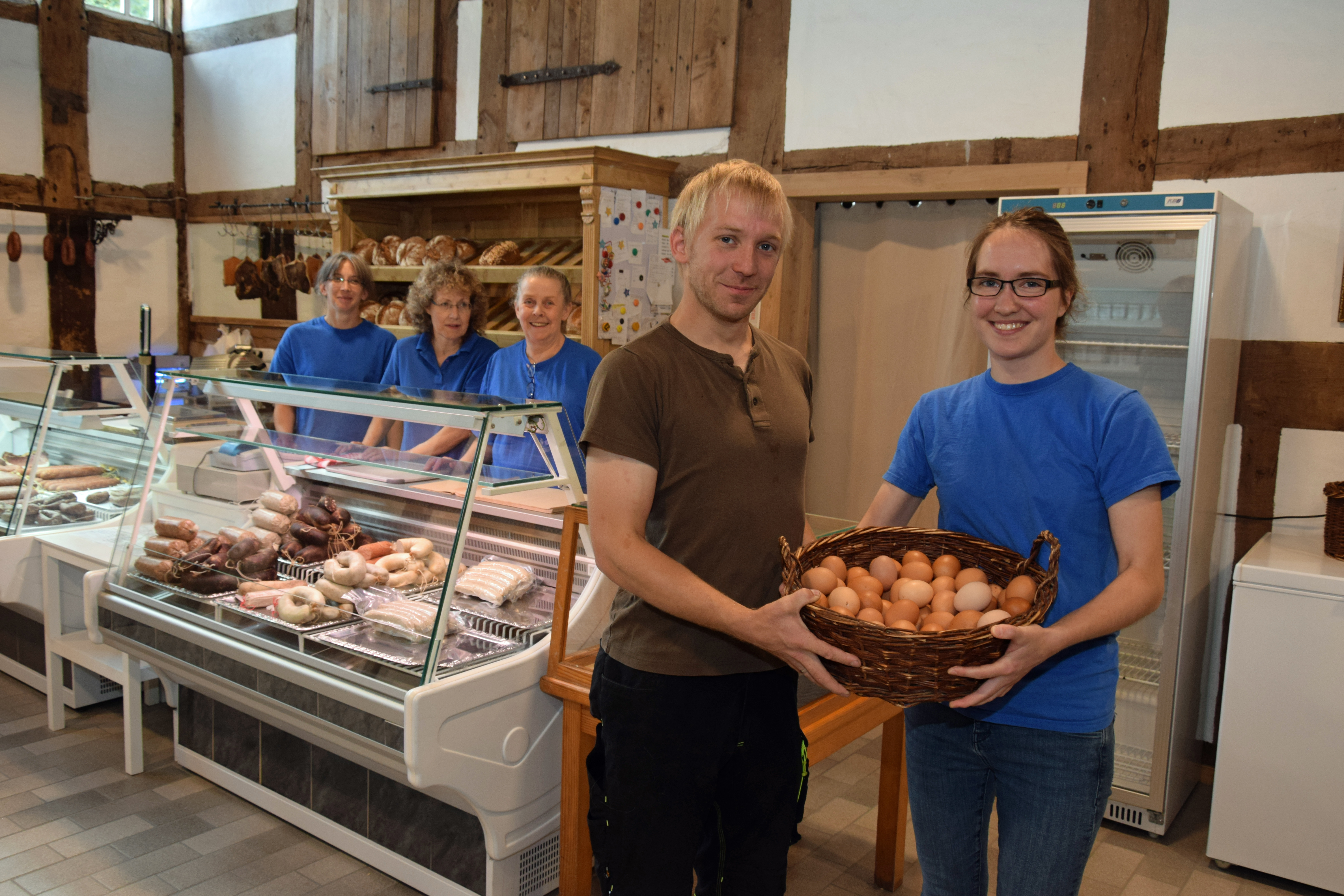 Fleisch vom Schwein (Mittwoch und Donnerstag), Hausmacherwurst im Darm Hausmacherwurst in Gläsern, Mettwurst luftgetrocknet, Bauchfleisch geräuchert, Schinken luftgetrocknet und geräuchert. 16 verschiedene Eintöpfe in Gläsern, 14 verschiedene Fertiggerichte. Brot aus dem historischen Lehmofen. Konfitüren und Gelees, Brotaufstriche und Liköre. Zum Wochenende schlachtfrische Hähnchen, Puten, Gänse und Enten ab November. Apfelsaft von Streuobstwiese.