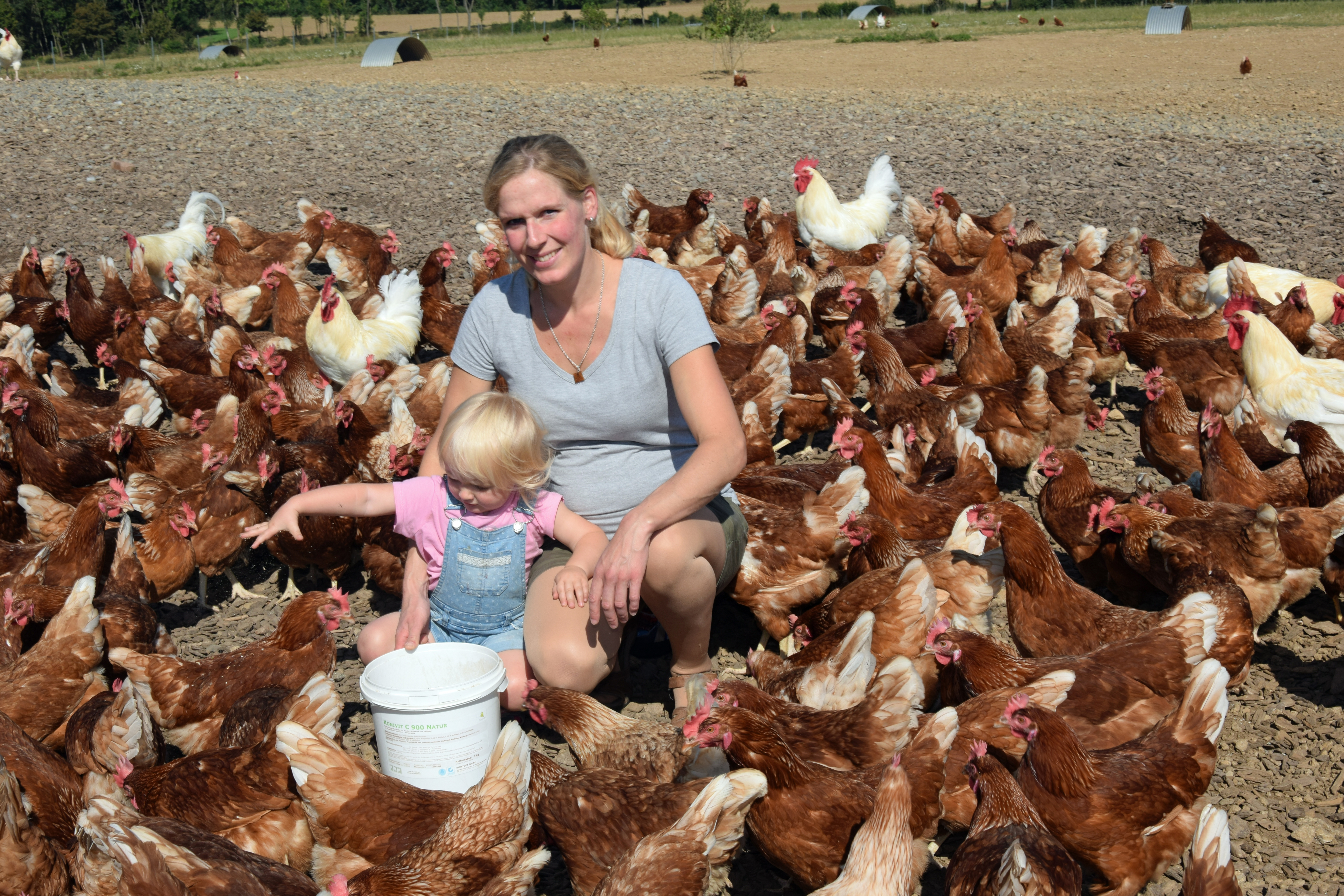 Jeden Morgen um 10 Uhr gehen automatisch die Klappen der beiden Stallgebäude hoch, und die Hühner können sich tagsüber auf der 3,6 Hektar großen Wiese draußen „vergnügen“. Wem das Wetter allerdings zu schlecht ist, kann im Wintergarten bleiben. Auf dem großen Auslauf-Gelände schützen Rundbleche die Hühner vor Greifvögel. Gefüttert wird mit hauseigenem Bio-Getreide.
