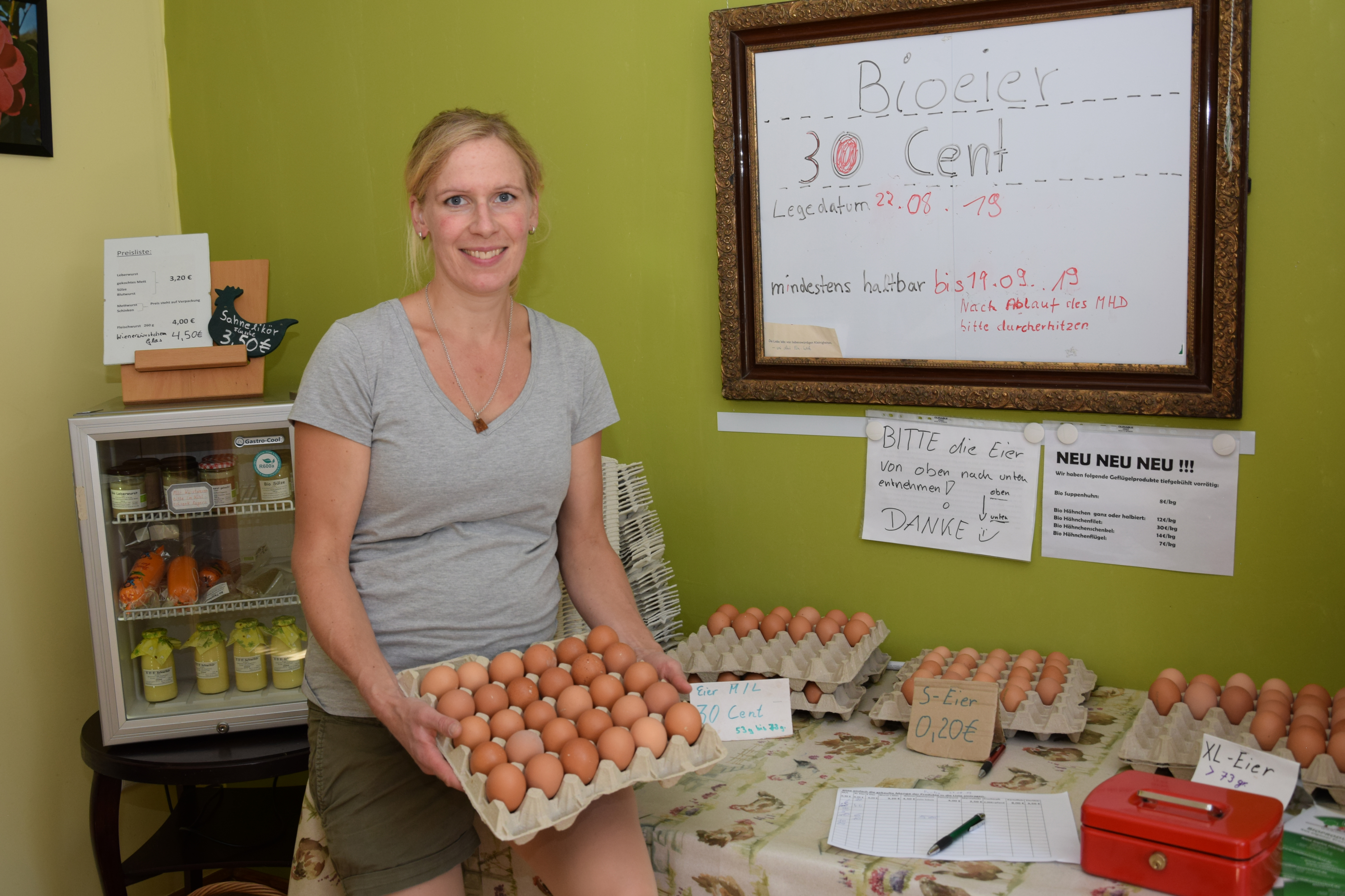 Wer möchte, kann auch Biohähnchen, Biosuppenhühner und Bioschweinefleisch bestellen. „Besonders gefragt sind zu der Grillzeit natürlich Bratwürstchen“, sagt Michael Meyer. Außerdem im Angebot des Hofladens sind leckerer Eierlikör und Biokartoffeln. Die Kunden greifen auch gern zu Fruchtsäften von Streuobstwiesen und zu verschiedenen Fruchtaufstrichen, die zwar nicht nach Bio-Richtlinien hergestellt sind, sich aber trotzdem durch hohe Qualität und bestem Geschmack auszeichnen. Unbedingt probieren!