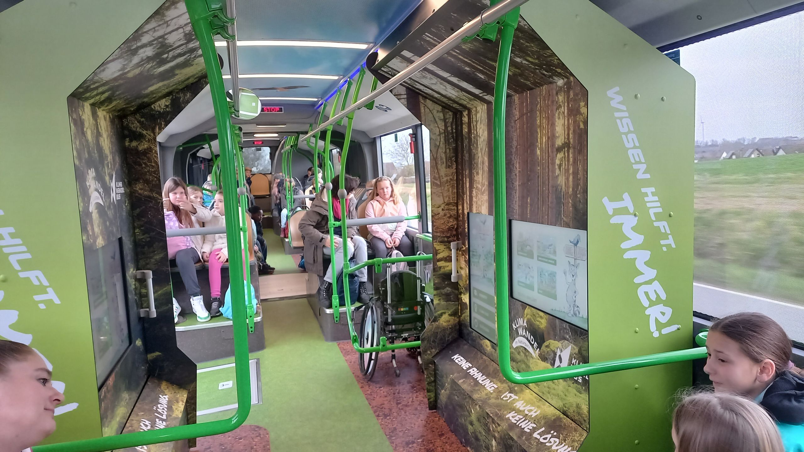 Ein Bus für den Klimawandel und so schön bunt? Genau! Ein richtiger “Omnibus”. Das veraltete Wort passt perfekt. Omni bedeutet alle. Und dieser Elektrobus nimmt alle auf ihrem Weg zur oder von der Schule, im Alltag zur Arbeit oder nach Hause mit. Kleine und große Leute fahren mit dem Klimawandelbus, er fährt im regulären Busverkehr im Kreis Lippe. Und er bringt Schulkinder zu Exkursionen im Naturpark und wieder zurück. Dabei besucht jeder Mitfahrende automatisch die Ausstellung im Bus zum normalen Fahrpreis. Interaktive Elemente informieren wie erneuerbare Energie funktioniert, lassen hören, wie eine Eule klingt oder ein Wildschwein.